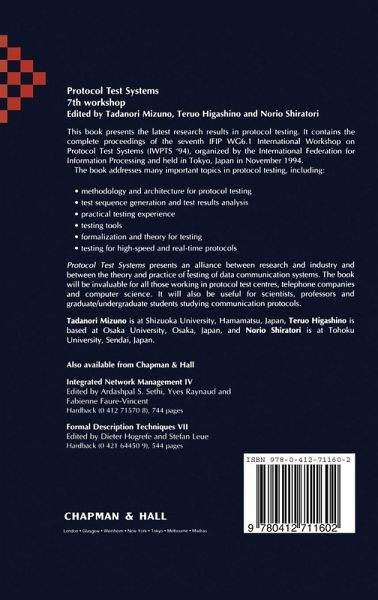 This is the Proceedings of the 7th IFIP WG6.1 International Workshop on Protocol Test Systems (IWPTS'94) which was held in Tokyo, Japan on November 8-10, 1994. After having been organized in Vancouver (Canada, 1988), Berlin (Germany, 1989), McLean (USA, 1990), Leidschendam (The Netherlands, 1991), Montreal (Canada, 1992) and Pau (France, 1993), this is the 7th international workshop. The aim of the workshop is to be a meeting point between research and industry and between theory and practice of the testing of data communication systems. The workshop consists of the presentations of reviewed and invited papers, tool demonstrations and panel sessions. All submitted papers have been reviewed by the members of the Program Committee and the following additional reviewers including: L. Andrey, N. Arakawa, D. Becam, L. Boullier, R. Dssouli, B. Forghani, M. Higuchi, L. Heerink, G. Huecas, M. Hunter, S. lisaku, Y. Kakuda, K. Kazama, L-S. Koh , R. Langerak, D. Lee, G. Leon, G. Luo, P. Maigron, M. Mori, A. Nakamura, S. Nightingale, K. Okada, K. Okano, N. Okazaki, A. Petrenko, M. Phalippou, A. Rennoch, F. Sato, Y. Sugito, D. Tang, D. Toggweiler, F. Vallo and J. Zhu. The Program Committee has selected excellent papers among them. This proceedings includes two invited papers, fifteen regular papers, six short papers, two panel reports and one panel paper which were presented in the workshop.