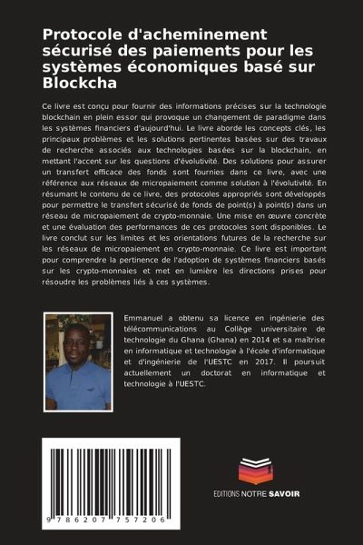 Ce livre est conçu pour fournir des informations précises sur la technologie blockchain en plein essor qui provoque un changement de paradigme dans les systèmes financiers d'aujourd'hui. Le livre aborde les concepts clés, les principaux problèmes et les solutions pertinentes basées sur des travaux de recherche associés aux technologies basées sur la blockchain, en mettant l'accent sur les questions d'évolutivité. Des solutions pour assurer un transfert efficace des fonds sont fournies dans ce livre, avec une référence aux réseaux de micropaiement comme solution à l'évolutivité. En résumant le contenu de ce livre, des protocoles appropriés sont développés pour permettre le transfert sécurisé de fonds de point(s) à point(s) dans un réseau de micropaiement de crypto-monnaie. Une mise en oeuvre concrète et une évaluation des performances de ces protocoles sont disponibles. Le livre conclut sur les limites et les orientations futures de la recherche sur les réseaux de micropaiement en crypto-monnaie. Ce livre est important pour comprendre la pertinence de l'adoption de systèmes financiers basés sur les crypto-monnaies et met en lumière les directions prises pour résoudre les problèmes liés à ces systèmes.