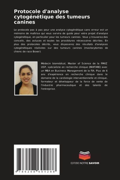 Le protocole pas à pas pour une analyse cytogénétique sans erreur est un mémoire de maîtrise qui vous servira de guide pour votre projet d'analyse cytogénétique, en particulier pour les tumeurs canines. Vous y trouverez des conseils, des astuces et toutes les procédures nécessaires décrites. En plus des protocoles décrits, vous disposerez des résultats d'analyses cytogénétiques réalisées sur des tumeurs canines (mastocytomes de chiens de race Boxer).