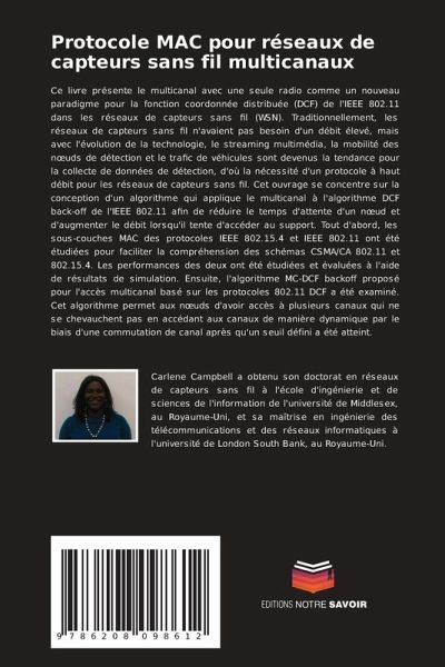 Ce livre présente le multicanal avec une seule radio comme un nouveau paradigme pour la fonction coordonnée distribuée (DCF) de l'IEEE 802.11 dans les réseaux de capteurs sans fil (WSN). Traditionnellement, les réseaux de capteurs sans fil n'avaient pas besoin d'un débit élevé, mais avec l'évolution de la technologie, le streaming multimédia, la mobilité des noeuds de détection et le trafic de véhicules sont devenus la tendance pour la collecte de données de détection, d'où la nécessité d'un protocole à haut débit pour les réseaux de capteurs sans fil. Cet ouvrage se concentre sur la conception d'un algorithme qui applique le multicanal à l'algorithme DCF back-off de l'IEEE 802.11 afin de réduire le temps d'attente d'un noeud et d'augmenter le débit lorsqu'il tente d'accéder au support. Tout d'abord, les sous-couches MAC des protocoles IEEE 802.15.4 et IEEE 802.11 ont été étudiées pour faciliter la compréhension des schémas CSMA/CA 802.11 et 802.15.4. Les performances des deux ont été étudiées et évaluées à l'aide de résultats de simulation. Ensuite, l'algorithme MC-DCF backoff proposé pour l'accès multicanal basé sur les protocoles 802.11 DCF a été examiné. Cet algorithme permet aux noeuds d'avoir accès à plusieurs canaux qui ne se chevauchent pas en accédant aux canaux de manière dynamique par le biais d'une commutation de canal après qu'un seuil défini a été atteint.