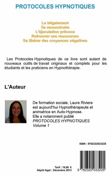 Les 5 Protocoles Hypnotiques de ce livre sont autant de nouveaux outils de travail originaux et complets pour les étudiants et les Praticiens en Hypnothérapie : l'éjaculation précoce, le bégaiement, se libérer des croyances négatives, retrouver ses ressources, se reconstruire.