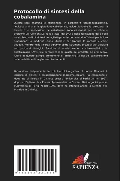 Questo libro esamina le cobalamine, in particolare l'idrossocobalamina, l'etilcobalamina e la glutatione-cobalamina, evidenziandone la struttura, la sintesi e le applicazioni. Le cobalamine sono essenziali per la salute e svolgono un ruolo chiave nella sintesi del DNA e nella formazione dei globuli rossi. Protocolli di sintesi dettagliati garantiscono metodi efficienti per la loro produzione. In medicina, sono utilizzate per trattare le carenze e come antidoti, mentre nella ricerca servono come strumenti preziosi per studiare vari processi biologici. Tecniche di analisi come la microanalisi e la spettroscopia UV-visibile garantiscono la qualità del prodotto. Le prospettive future in questo campo promettono di arricchire la nostra comprensione delle malattie e di migliorare i trattamenti.