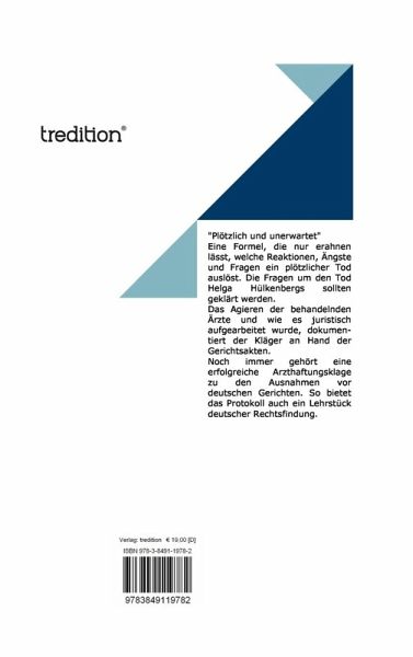 "Plötzlich und unerwartet"Eine Formel, die nur erahnen lässt, welche Reaktionen, Ängste und Fragen ein plötzlicher, unerwarteter Tod auslöst. Die Fragen um diesen Tod sollten geklärt werden.Das versprach der Witwer den Trauergästen. Es dauerte fast 10 Jahre, bis die Ergebnisse dieser Klärung vorlagen. Das Kölner Landgericht hat im Urteil vom 30. September 2009 bestätigt: Der Tod Helga Hülkenbergs am 09. Juni 2000 war Folge grobfahrlässigen Handelns des behandelnden Internisten.Was damals geschah und wie es juristisch aufgearbeitet wurde, dokumentierte der Kläger im "Protokoll eines vermeidbaren Todes".