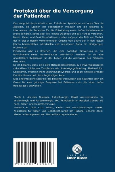 Das Hauptziel dieser Arbeit ist es, Zahnärzte, Spezialisten und Ärzte über die Ätiologie, die Stadien der odontogenen Infektion und die Faktoren zu informieren, die Patienten für die Entwicklung eines tiefen Halsabszesses prädisponieren, sowie über die richtige Diagnose und das richtige Vorgehen.Mund-, Kiefer- und Gesichtsinfektionen stellen aufgrund der Fülle und Vielfalt der in dieser Region vorkommenden Organismen sowie der in den letzten Jahren beobachteten mikrobiellen und resistenten Natur ein einzigartiges Problem dar.Inzwischen gibt es Kriterien, die eine sofortige Einweisung in die Notaufnahme eines Krankenhauses erforderlich machen, da sie eine unmittelbare Bedrohung für das Leben und die Atemwege des Patienten darstellen.Es ist bekannt, dass eine tiefe Halsabszessinfektion zu schwerwiegenderen sekundären klinischen Zuständen wie Atemwegsgefährdung, Mediastinitis, Septikämie, systemischem Entzündungssyndrom und sogar nekrotisierender Fasziitis führen und diese begünstigen kann.Eine angemessene Kontrolle der Begleiterkrankungen des Patienten kann ein Grund für eine günstige Prognose bei Patienten sein, die einen tiefen Halsabszess entwickeln.