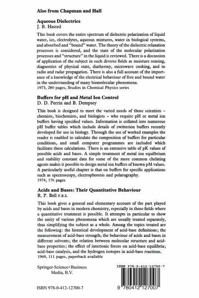 1 Proton acids, Lewis acids, hard acids, soft acids and superacids.- 2 Gas-phase proton-transfer equilibria.- 3 Proton-transfer and the solvation of ammonium ions.- 4 Participation of hydroxylic solvent molecules.- 5 Hydrogen bonding and proton-transfer reactions in non-aqueous solvents.- 6 Fast and slow proton-transfer reactions in solution.- 7 The Brønsted relation; significance of the exponent.- 8 Substrate isotope effects.- 9 Solvent isotope effects.- 10 Tunnelling in hydrogen transfer reactions.- 11 Neighbouring group participation.- 12 Proton-transfer in enzymatic catalysis.- 13 Heterogeneous proton-transfer reactions.