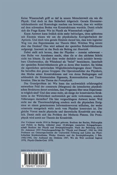 Inhaltverzeichnis.- 1. Kapitel Prolegomena Zu Einer Protophysik Als Strenger Wissenschaft.- 1. Vom Sinn des Transzendentalen in der Physik.- 2. Die Struktur des Michelson-Versuchs.- 3. Die Obligate.- 4. Kennzeichnung der Glaubenss¿e.- 5. Glaubenss¿e sind keine Konstruktionen.- 6. Glaubenss¿e und Axiome.- 7. Technische und absolute Apriorit¿- 8. Zur Gewi¿eit des physikalischen Glaubens.- 9. Vom Realit¿gehalt der Glaubenss¿e.- 10. Wechselwirkung zwischen Glaube und Wissen.- 2. Kapitel Allgemeine Glaubenss¿e.- 1. Vorl¿ige Ortung der Glaubenss¿e.- 2. Erfahrungskatalog.- 3. Darstellungskatalog.- 4. Bestimmungskatalog.- 5. Theoriekatalog.- 3. Kapitel Der Imperiale Pluralismus.- 1. Intendiertes Universum und intentionale Universa.- 2. Theoretische Bezugssysteme.- 3. Die Definition der Gleichzeitigkeit.- 4. Kapitel Der Imperiale Pluralismus in Funktion.- 1. Der Sollwert.- 2. Heuristische Anfragen: Das Beobachtungspostulat.- 3. Ver- und Entschl¿sselungen.- 4. Die Zeitmessung.- 5. Uhren.- 6. Koinzidenzen.- 7. Die Zeit-Prinzipien.- 8. Die Gleichzeitigkeit entfernter Ereignisse.- 9. Zugzwang und Freiheit.- 10. Ziel und Vorwissen.- 11. Die Sph¿n.- 12. Sch¿pferische Ereignisse.- 5. Kapitel Bezugssysteme.- 1. Kommunikatoren.- 2. Die Information: Eine vorl¿ige Er¿rterung.- 3. Idealisierte Bezugssysteme.- 4. Autonome transphysische BS.- 5. Imperiale Pluralit¿und Operationalismus.- 6. Imperiale Pluralit¿der Gleichzeitigkeit.- 7. Sch¿pferischer Geist.- 8. Verzahnte Subjekt-Objekt-Beziehungen.- 6. Kapitel Die Relativit¿- 1. Erste Schritte.- 2. Relativit¿und Glaubenss¿e.- 3. Keine Wirkursachen.- 4. Information und Relativit¿- 5. Der Weltbeobachter.- 6. Relativit¿und Ph¿mencharakter der Welt.- 7. Projektive Realit¿- 8. Die Minkowskiwelt.- 9. Informationstypen.- 10. Imperialer H¿henweg.- 11. Imperiale Interdependenz.- 12. Die ?-Zeit.- 13. Erste Auskunft ¿ber den Raum.- 14. Das Feld.- 15. Vision¿ Physik.- 16. Der Glaube des Physikers.- 17. Glaube und Freiheit.- 7. Kapitel Modale Pluralit¿- 1. Paradoxien der Inertialsysteme.- 2. N¿rungen.- 3. Struktur-Hierarchie.- 4. Die Null-Struktur.- 5. Die Inertialbewegung.- 6. N¿rungsstrukturen.- 7. Die Ableitung der Inertialbewegung aus den Feldgleichungen.- 8. Die Erzeugung der Inertialit¿- 9. Ontologie der Null-Struktur.- 8. Kapitel Die Existenziale Pluralit¿ Eigenstein, Kommunikation und Transkreation.- 1. Problemstellung.- 2. Dualer Massenbegriff.- 3. Die Konstruktion der Noo-Masse.- 4. Konstruktionsmasse und Wirkmasse.- 5. Das Eigen-Sein und die Erzeugung der Koordinaten-Masse.- 6. Umweg ¿ber die Lorentz-Geometrie: Masse und Zeit.- 7. Vom Wesen der Masse.- 8. Alpha-Struktur und Energie.- 9. Die kategoriale Aufspaltung von Masse, Energie und Impuls.- 10. Die B- und ?-Masse.- 11. Grundbewegungen der Kreativit¿- 9. Kapitel Der Raum Des Sch¿pferischen.- 1. Die Quellen.- 2. Die Syntax des Sch¿pferischen.- 3. Die Dimensionen der Existenz.- 4. Die Entfaltung der modi.- 5. Der Traubenraum des Sch¿pferischen.- 6. Der Glaube.