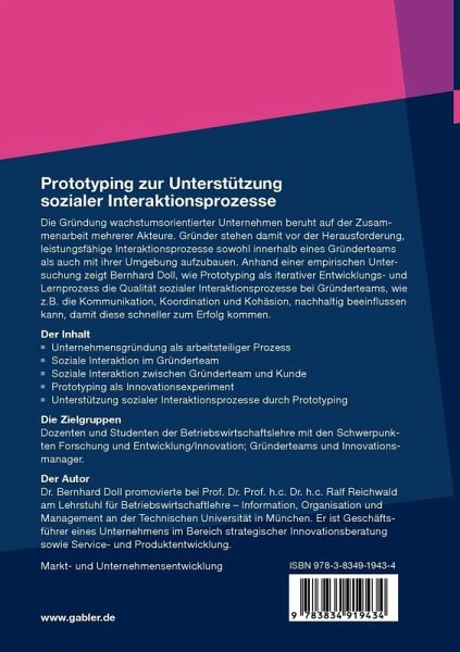 Die Gründung wachstumsorientierter Unternehmen beruht auf der Zusammenarbeit mehrerer Akteure. Gründer stehen damit vor der Herausforderung, leistungsfähige Interaktionsprozesse sowohl innerhalb eines Gründerteams als auch mit ihrer Umgebung aufzubauen. Anhand einer empirischen Untersuchung zeigt Bernhard Doll, wie Prototyping als iterativer Entwicklungs- und Lernprozess die Qualität sozialer Interaktionsprozesse bei Gründerteams, wie z.B. die Kommunikation, Koordination und Kohäsion, nachhaltig beeinflussen kann, damit diese schneller zum Erfolg kommen.