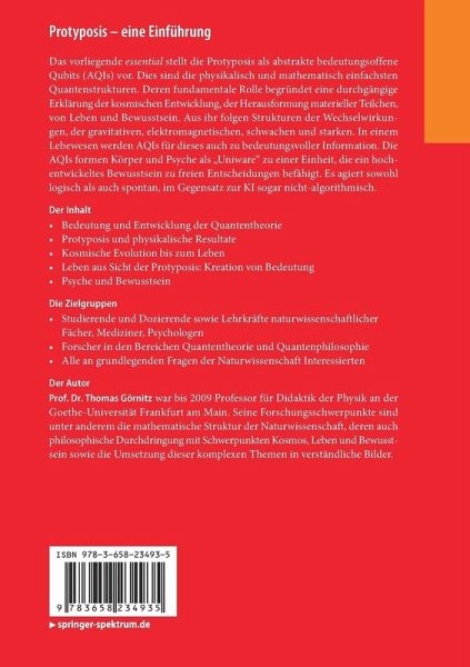 Das vorliegende essential stellt die Protyposis als abstrakte bedeutungsoffene Qubits (AQIs) vor. Dies sind die physikalisch und mathematisch einfachsten Quantenstrukturen. Deren fundamentale Rolle begründet eine durchgängige Erklärung der kosmischen Entwicklung, der Herausformung materieller Teilchen, von Leben und Bewusstsein. Aus ihr folgen Strukturen der Wechselwirkungen, der gravitativen, elektromagnetischen, schwachen und starken. In einem Lebewesen werden AQIs für dieses auch zu bedeutungsvoller Information. Die AQIs formen Körper und Psyche als "Uniware" zu einer Einheit, die ein hochentwickeltes Bewusstsein zu freien Entscheidungen befähigt. Es agiert sowohl logisch als auch spontan, im Gegensatz zur KI sogar nicht-algorithmisch.
