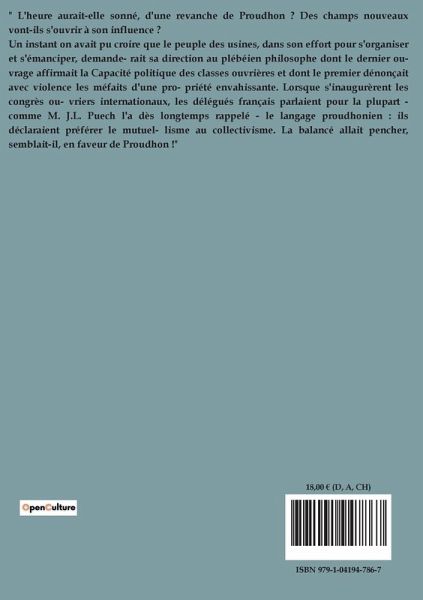 " L'heure aurait-elle sonné, d'une revanche de Proudhon ? Des champs nouveaux vont-ils s'ouvrir à son influence ? Un instant on avait pu croire que le peuple des usines, dans son effort pour s'organiser et s'émanciper, demande- rait sa direction au plébéien philosophe dont le dernier ou- vrage affirmait la Capacité politique des classes ouvrières et dont le premier dénonçait avec violence les méfaits d'une pro- priété envahissante. Lorsque s'inaugurèrent les congrès ou- vriers internationaux, les délégués français parlaient pour la plupart - comme M. J.L. Puech l'a dès longtemps rappelé - le langage proudhonien : ils déclaraient préférer le mutuel- lisme au collectivisme. La balancé allait pencher, semblait-il, en faveur de Proudhon !"