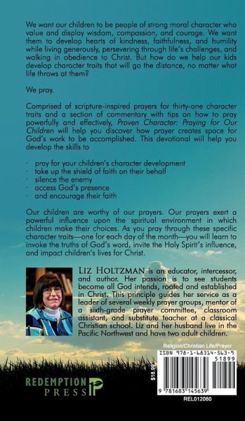 We want our children to be people of strong moral character who value and display wisdom, compassion, and courage. We want them to develop hearts of kindness, faithfulness, and humility while living generously, persevering through life's challenges, and walking in obedience to Christ. But how do we help our kids develop character traits that will go the distance, no matter what life throws at them? We pray. Comprised of scripture-inspired prayers for thirty-one character traits and a section of commentary with tips on how to pray powerfully and effectively, Proven Character: Praying for Our Children will help you discover how prayer creates space for God's work to be accomplished. This devotional will help you develop the skills to pray for your children's character development, take up the shield of faith on their behalf, silence the enemy, access God's presence, and encourage their faith. Our children are worthy of our prayers. Our prayers exert a powerful influence upon the spiritual environment in which children make their choices. As you pray through these specific character traits-one for each day of the month-you will learn to invoke the truths of God's word, invite the Holy Spirit's influence, and impact children's lives for Christ.