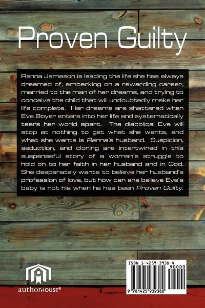 Renna Jameson is leading the life she has always dreamed of, embarking on a rewarding career, married to the man of her dreams, and trying to conceive the child that will undoubtedly make her life complete. Her dreams are shattered when Eve Boyer enters into her life and systematically tears her world apart. The diabolical Eve will stop at nothing to get what she wants, and what she wants is Renna's husband. Suspicion, seduction, and cloning are intertwined in this suspenseful story of a woman's struggle to hold on to her faith in her husband and in God. She desperately wants to believe her husband's profession of love, but how can she believe Eve's baby is not his when he has been Proven Guilty.