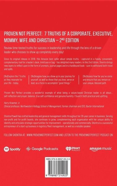 Review time-tested truths for success in leadership and life through the lens of a driven leader who chooses to show up completely every day! Since its original release in 2018, this Amazon best seller about simple truths - captured in a handy, convenient, complementary tool for a leader's desk, briefcase or bag - has delighted many readers. In this 2nd Edition, Shontra brings new layers to reflect upon in the form of prompts, journal pages and in a hardbound book - sure to withstand both travel and spills. ¿ (Re)Explore the 7 truths as they resonate for your life - today. (Re)Imagine how you show up in your journey for yourself, as well as those that you love, serve or lead; as a force to accomplish "good things." (Re)Assess how far you've come and ensure that you remain on your unique, blessed path. ___________________________________________________________________________ Proven Not Perfect provides a wonderful example of what being a values-based Christian leader is all about... self-reflection and prayer, balance, true self-confidence and genuine humility. I found it both practical and uplifting."Harry Kraemer, Jr. Clinical professor, Northwestern Kellogg School of Management; former chairman and CEO, Baxter International