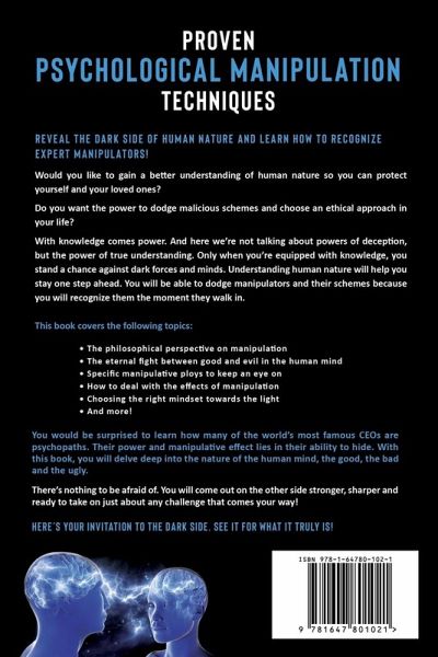 Reveal the Dark Side of Human Nature and Learn How to Recognize Expert Manipulators! Would you like to gain a better understanding of human nature so you can protect yourself and your loved ones? Do you want the power to dodge malicious schemes and choose an ethical approach in your life? Manipulation is almost a taboo topic in our society. But if we want to protect ourselves, we must understand the mind behind this behavior. In your everyday life and work, you meet all kinds of people. Some of them have good intentions and some don't. To be able to live good lives and be the good leaders our communities need us to be, we must learn to see beyond the masks some people put up. Understanding what lies behind someone's actions and intentions is a key component of a balanced, protective, and efficient response. If you're not careful, you or your loved ones may fall victim to narcissists, psychopaths, and expert manipulators. Although most people avoid this topic altogether and pretend we're living in a perfect world, that is not an option for inquiring minds. When it comes to making the right decisions, we must have all the information. It's necessary to go beyond the obvious. You need and deserve an uncompromising look into some of the darkest facets of human nature. With knowledge comes power. And here we're not talking about powers of deception, but the power of true understanding. Only when you're equipped with the knowledge, you stand a chance against dark forces and minds. Understanding human nature will help you stay one step ahead. You will be able to dodge manipulators and their schemes because you will recognize them the moment they walk in. This book is an in-depth study of these dark corners of the human mind, and it will become your shield and tool for living an ethical life.This book covers the following topics: What is psychological manipulation The philosophical perspective on manipulation The eternal fight between good and evil in the human mind Specific manipulative ploys to keep an eye on How to deal with the effects of manipulation What makes us susceptible to narcissists Choosing the right mindset towards the light You would be surprised to learn how many of the world's most famous CEOs are psychopaths. Working and living among them can be dangerous, especially if we become their target. Their power and manipulative effect lies in their ability to hide. But, as intelligent people, we can learn to recognize and understand the dark psychology, even if we don't relate to it. With this book, you will delve deep into the nature of the human mind, the good, the bad, and the ugly. It's nothing to be afraid of. You will come out on the other side stronger, sharper, and ready to take on just about any challenge that comes your way! Ready to find out how the world really works? Scroll up, click on 'Buy Now with 1-Click', and Get Your Copy!