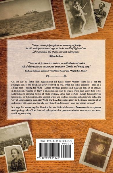 Selected for the 2017 Go On Girl Book Club reading list and, a finalist for 2016 Phillis Wheatley Award for First Fiction. Southern civility turns savage when Hank Whitaker's dying words reveal the unimaginable. No one-not his socialite wife, Maggie, or young son, Lance-ever suspected the successful businessman, husband and father they knew and loved was a black man passing for white. In 1931, in the segregated South, marriage between whites and blacks is illegal. Maggie faces the real possibility of jail and, when Lance receives death threats to atone for his father's betrayal, the family flees the U.S. for Paris. Still grieving Hank's death and fearful of their uncertain future as Europe marches toward war, Lance and Maggie mourn the lives they loved but lost. As they struggle to create a new lives and identities for themselves, they find a surprising community of artists and American expats that are on the same journey. Provenance is a sweeping historical saga about love, betrayal, tragedy, triumph, passion, privilege and the universal desire for acceptance-regardless of who you are or where you're from. "Such a satisfying read. This page-turner has characters steeped in psychological depth, a setting rich with historical context and a narrative that explores the heart-wrenching evolution of racial identity in America. Sawyer has brought us some solid storytelling with this fine book. I didn't want it to end!" Karen Deans author of Playing to Win and Swing Sisters "Provenance is a gripping story with wonderful characters, and Sawyer manages to blend fiction and history in a convincing way. This is a quick, but substantive read that will nudge (if not force) you to rethink your perceptions of wealth, art, and racial identity." Kelly Hand author of Au Pair Report "Provenance is the perfect combination of a love story and historical fiction with added reflection on our country's struggle with race. Although this novel is set in the early 1900s, it was striking how many of the themes around race, privilege and survival are still relevant today." Kristin Battista-Frazee author of Pornographer's Daughter "A memorable tale of love, loss and redemption." Kirkus Review