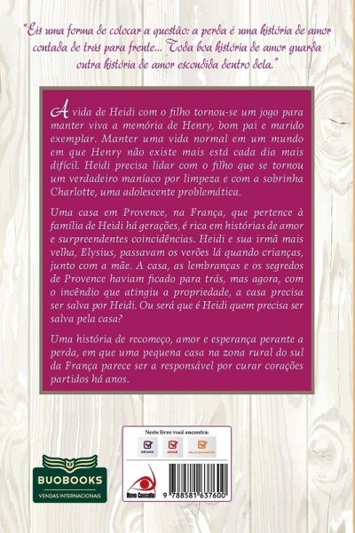 Eis uma forma de colocar a questão: a perda é uma história de amor contada de trás para frente... Toda boa história de amor guarda outra história de amor escondida dentro dela." A vida de Heidi com o filho tornou-se um jogo para manter viva a memória de Henry, bom pai e marido exemplar. Manter uma vida normal em um mundo em que Henry não existe mais está cada dia mais difícil. Heidi precisa lidar com o filho que se tornou um verdadeiro maníaco por limpeza e com a sobrinha Charlotte, uma adolescente problemática. Uma casa em Provence, na França, que pertence à família de Heidi há gerações, é rica em histórias de amor e surpreendentes coincidências. Heidi e sua irmã mais velha, Elysius, passavam os verões lá quando crianças, junto com a mãe. A casa, as lembranças e os segredos de Provence haviam ficado para trás, mas agora, com o incêndio que atingiu a propriedade, a casa precisa ser salva por Heidi. Ou será que é Heidi quem precisa ser salva pela casa? Uma história de recomeço, amor e esperança perante a perda, em que uma pequena casa na zona rural do sul da França parece ser a responsável por curar corações partidos há anos.