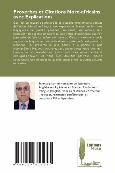 Ceci est un recueil de proverbes et citations nord-africains traduits de l'arabe dialectal au français avec explications. Ils sont des formules langagières de portée générale contenant une morale, une expression de sagesse populaire ou une vérité d'expérience que l'on juge utile de faire connaître aux autres . Chacun y trouvera de la sagesse sur le quotidien, sur la vie d'une société qui lui est peut-être inconnue. Du proverbe le plus connu à la phrase la plus incompréhensible, vous trouverez sans aucun doute votre bonheur. L'étude de ces proverbes et citations que nous avons traduits et expliqués peuvent et nous n'en doutons pas vous aider à comprendre les similitudes et les différences entre les autres cultures et la vôtre.