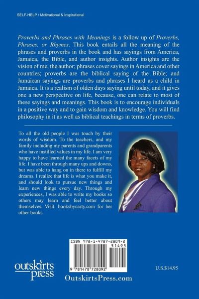 Proverbs and Phrases with Meanings is a follow up of Proverbs, Phrases, or Rhymes. This book entails all the meaning of the phrases and proverbs in the book and has sayings from America, Jamaica, the Bible, and author insights. Author insights are the vision of me, the author; phrases cover sayings in America and other countries; proverbs are the biblical saying of the Bible; and Jamaican sayings are proverbs and phrases I heard as a child in Jamaica. It is a realism of olden days saying until today, and it gives one a new perspective on life, because, one can relate to most of these sayings and meanings. This book is to encourage individuals in a positive way and to gain wisdom and knowledge. You will find philosophy in it as well as biblical teachings in terms of proverbs.