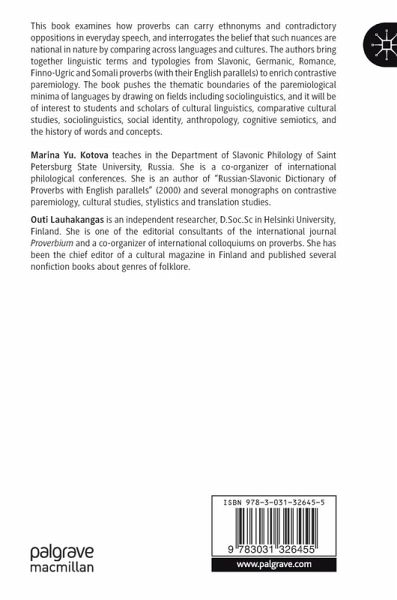 This book examines how proverbs can carry ethnonyms and contradictory oppositions in everyday speech, and interrogates the belief that such nuances are national in nature by comparing across languages and cultures. The authors bring together linguistic terms and typologies from Slavonic, Germanic, Romance, Finno-Ugric and Somali proverbs (with their English parallels) to enrich contrastive paremiology. The book pushes the thematic boundaries of the paremiological minima of languages by drawing on fields including sociolinguistics, and it will be of interest to students and scholars of cultural linguistics, comparative cultural studies, sociolinguistics, social identity, anthropology, cognitive semiotics, and the history of words and concepts.