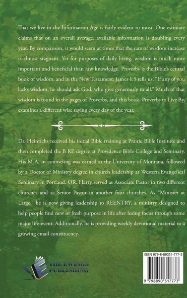 That we live in the information Age is fairly evident to most. One estimate claims that on an overall average, available information is doubling every year. By comparison, it would seem at times that the rate of wisdom increase is almost stagnant. Yet for purposes of daily living, wisdom is much more important and beneficial than raw knowledge. Proverbs is the Bible's central book of wisdom, and in the New Testament. James 1:5 tells us, "If any of you lacks wisdom, he should ask God, who give generously to all." Much of that wisdom is found in the pages of Proverbs, and this book, Proverbs to Live By, examines a different wise saying every day of the year.