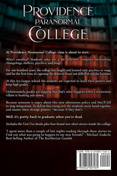 At Providence Paranormal College, class is about to start.Who's enrolled? Students who are a bit different: vampires, werewolves, changelings, shifters, psychics, and magi.For one-hundred years, the college has taught and trained only psychics or magi, and for the first time, it's opening the doors to those not different: regular humans.At this Ivy-League school, the students are expected to learn their powers and keep high grades.Unfortunately, grades are slipping, but that's what happens when a mysterious villain is hunting you down...Because someone is angry about this new admissions policy and they'll kill to stop integration. To defeat this rising evil, the students must band together and master their strange powers - because if they don't..Well, it's pretty hard to graduate when you're dead.Includes the first five books plus four brand new short stories inside the college."I spent more than a couple of late nights reading through these stories to find out what was going to happen to my new friends!" - Michael Anderle, Best-Selling Author of The Kurtherian GambitThis series is for fans of Harry Potter, Jaymin Eve, and all academy books.Go up and click 'Read for Free' or 'Buy Now' and start reading today!