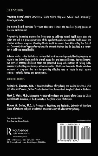 Preface 1. Principles Behind the Proactive Delivery of Mental Health Services to Youth Where They Are, Mark D.Weist and Harinder S. Ghuman 2. Expanded School Mental Health: Developing Services to Mesh with Youth Needs and Community Resources, Mark D. Weist, Laura A. Nabors andOlga M. Acosta 3. Stakeholder Involvement and Quality Improvement in School Mental Health, Laura Nabors, NancyA. Tashman, Melissa Grady and Mark D. Weist 4. Organization, Utilization, and Evaluation of a School Mental Health Program, Steven Evans 5. Reflections on the Development of an Elementary School Mental Health Program, Jennifer A. Oppenheim and Robert J. Evert 6. Developing Culturally Sensitive and Family-Focused School Mental Health Services for Texas Youth, Vincent Ramos,Jennifer Jenning and Glen Pearson 7. Historical Overview and Various Models of Home and Community-Based Interventions, Harinder S. Ghuman 8. Home and Community-Based Treatment Program for Severely Disturbed Treatment Resistant Youth and Their Families, EileenHastings, Marsha Gorth and Harinder S. Ghuman 9. Development and Implementation of Child Mobile Crisis System for Emotionally Disturbed Youth, Paramjit T.Joshi, Michelle Leff, Mark Greenberg and PatriciaKronin 10. Hospital on Wheel: Changing Public Sector Orientation from Inpatient Treatment to in Home and Community-Based Treatment for Seriously Disturbed Youth in the State of Delaware, Anita Amurao and MichaelLongo 11. Family Driven Treatment: Methods for Families to be Full Partner in the Care of Children with Psychiatric Illness, Charles Huffine, Ann Vander Stoepand Marilyn Williams 12. Narrative Family Therapy Approach to Wrap Around Services, Tom Hebeisen, MichaelLongo and Sam Blumberg