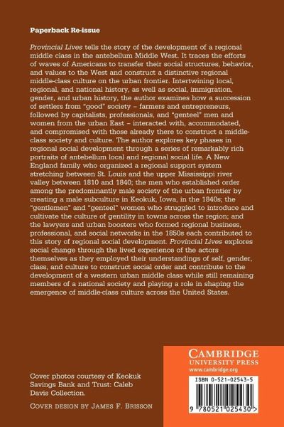 Provincial Lives tells the story of the development of a regional middle class in the antebellum Middle West. It traces the efforts of waves of Americans to transmit their social structures, behavior, and values to the West and construct a distinctive regional middle-class culture on the urban frontier. Intertwining local, regional, and national history, as well as social, immigration, gender and urban history, the author examines how a succession of settlers from 'good' society - farmers and entrepreneurs, followed by capitalists, professionals, and 'genteel' men and women from the urban East - interacted with, accommodated, and compromised with those already there to construct a middle-class society and culture. Provincial Lives explores social change through the lived experience of the actors themselves as they employed their understandings of self, gender, class, and culture to construct social order and contribute to the development of a western urban middle class while still remaining members of a national society and playing a role in shaping the emergence of middle-class culture across the United States.