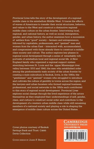 Provincial Lives, first published in 1999, tells the story of the development of a regional middle class in the antebellum Middle West. It traces the efforts of waves of Americans to transmit their social structures, behavior, and values to the West and construct a distinctive regional middle-class culture on the urban frontier. Intertwining local, regional, and national history, as well as social, immigration, gender and urban history, the author examines how a succession of settlers from 'good' society - farmers and entrepreneurs, followed by capitalists, professionals, and 'genteel' men and women from the urban East - interacted with, accommodated, and compromised with those already there to construct a middle-class society and culture. Provincial Lives explores social change through the lived experience of the actors themselves as they employed their understandings of self, gender, class, and culture to construct social order and contribute to the development of a western urban middle class while still remaining members of a national society and playing a role in shaping the emergence of middle-class culture across the United States.
