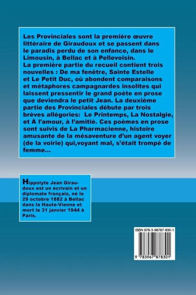 Les Provinciales sont la première ¿uvre littéraire de Giraudoux et se passent dans le paradis perdu de son enfance, dans le Limousin, à Bellac et à Pellevoisin. La première partie du recueil contient trois nouvelles : De ma fenêtre, Sainte Estelle et Le Petit Duc, où abondent comparaisons et métaphores campagnardes insolites qui laissent pressentir le grand poète en prose que deviendra le petit Jean. La deuxième partie des Provinciales débute par trois brèves allégories: Le Printemps, La Nostalgie, et À l'amour, à l'amitié. Ces poèmes en prose sont suivis de La Pharmacienne, histoire amusante de la mésaventure d'un agent voyer (de la voirie) qui,voyant mal, s'était trompé de femme...