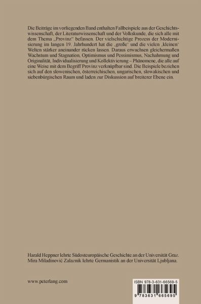 Die Beiträge im vorliegenden Band enthalten Fallbeispiele aus der Geschichtswissenschaft, der Literaturwissenschaft und der Volkskunde, die sich alle mit dem Thema "Provinz" befassen. Der vielschichtige Prozess der Modernisierung im langen 19. Jahrhundert hat die "große" und die vielen "kleinen" Welten stärker aneinander rücken lassen. Daraus erwuchsen gleichermaßen Wachstum und Stagnation, Optimismus und Pessimismus, Nachahmung und Originalität, Individualisierung und Kollektivierung - Phänomene, die alle auf eine Weise mit dem Begriff Provinz verknüpfbar sind. Die Beispiele beziehen sich auf den slowenischen, österreichischen, ungarischen, slowakischen und siebenbürgischen Raum und laden zur Diskussion auf breiterer Ebene ein.