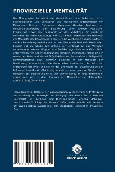 Die Monographie betrachtet die Mentalität als eine Reihe von sozio-psychologischen und spirituellen und moralischen Eigenschaften von Menschen: Struktur, Funktionen, allgemeine Gesetze, Faktoren der Mentalitätsentwicklung der Bevölkerung einer kleinen russischen Provinzstadt sowie eine bestimmte Art des Verhaltens, die durch die Merkmale der Mentalität erzeugt wird. Das Papier identifiziert die Merkmale der Mentalität der Bevölkerung, analysiert die wichtigsten sozialen Faktoren, die ihre Entstehung beeinflussen und den Wandel der Mentalität bestimmen. Letztlich soll die Studie den Einfluss der Mentalität auf das Verhalten verschiedener sozialer Gruppen und Bevölkerungsschichten in Kleinstädten unter veränderten Lebensbedingungen ermitteln. Traditionelle Merkmale der russischen Kultur und Mentalität (Kollektivismus, Paternalismus, Religiosität, Kommunitarismus usw.) kommen deutlicher in der Mentalität der Bevölkerung zum Ausdruck, die die Arbeitsmotivation und die politischen Präferenzen bestimmt und die Art der Einstellung der Bevölkerung zu den Reformen beeinflusst. Gleichzeitig erlaubt es eine gewisse Trägheit der Mentalität der Bevölkerung nicht, sich schnell genug an neue Beziehungen anzupassen, was zu dem Syndrom der Marginalisierung (Information, Status, Kultur) führen kann.