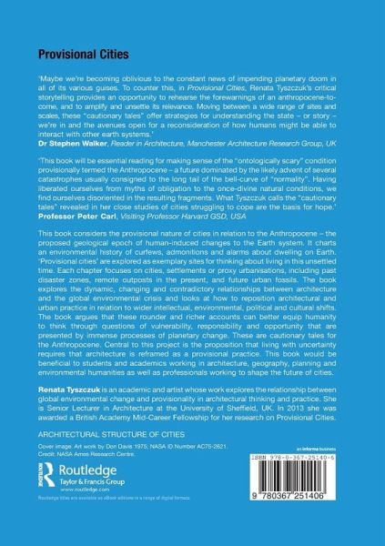 This book considers the provisional nature of cities in relation to the Anthropocene - the proposed geological epoch of human-induced changes to the Earth system. It charts an environmental history of curfews, admonitions and alarms about dwelling on Earth. 'Provisional cities' are explored as exemplary sites for thinking about living in this unsettled time. Each chapter focuses on cities, settlements or proxy urbanisations, including past disaster zones, remote outposts in the present and future urban fossils. The book explores the dynamic, changing and contradictory relationship between architecture and the global environmental crisis and looks at how to re-position architectural and urban practice in relation to wider intellectual, environmental, political and cultural shifts. The book argues that these rounder and richer accounts can better equip humanity to think through questions of vulnerability, responsibility and opportunity that are presented by immense processes of planetary change. These are cautionary tales for the Anthropocene. Central to this project is the proposition that living with uncertainty requires that architecture is reframed as a provisional practice. This book would be beneficial to students and academics working in architecture, geography, planning and environmental humanities as well as professionals working to shape the future of cities.