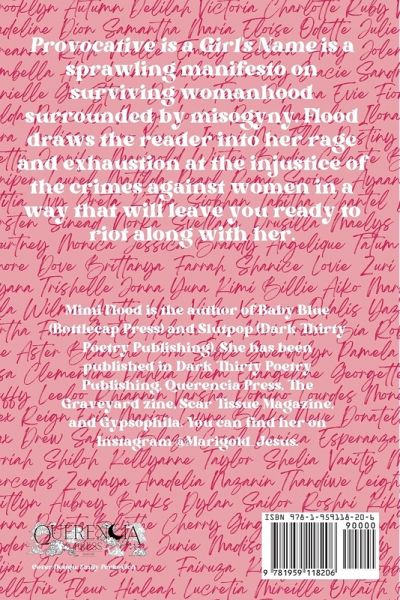 Provocative is a Girl's Name is a sprawling manifesto on surviving womanhood surrounded by misogyny. Flood draws the reader into her rage and exhaustion at the injustice of the crimes against women in a way that will leave you ready to riot along with her.