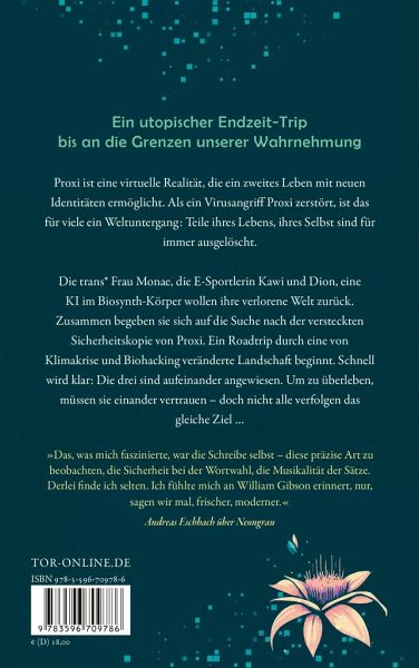 Proxi ist eine virtuelle Realität, die ein zweites Leben mit neuen Identitäten ermöglicht. Als ein Virusangriff diese Realität zerstört, ist das für viele ein Weltuntergang: Teile ihres Lebens, ihres Selbst sind für immer ausgelöscht. Die trans Frau Monae, die E-Sportlerin Kawi und Dion, eine KI im Biosynth-Körper wollen ihre verlorene Welt zurück. Zusammen begeben sie sich auf die Suche nach der versteckten Sicherheitskopie von Proxi. Ein Roadtrip durch eine von Klimakrise und Biohacking veränderte Landschaft beginnt. Schnell wird klar: Die drei sind aufeinander angewiesen. Um zu überleben und ihr Ziel zu erreichen, müssen sie einander vertrauen - doch nicht alle verfolgen das gleiche Ziel ...