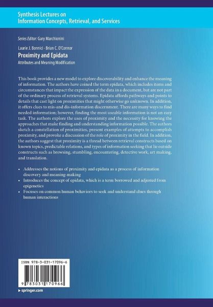 This book provides a new model to explore discoverability and enhance the meaning of information. The authors have coined the term epidata, which includes items and circumstances that impact the expression of the data in a document, but are not part of the ordinary process of retrieval systems. Epidata affords pathways and points to details that cast light on proximities that might otherwise go unknown. In addition, epidata are clues to mis-and dis-information discernment. There are many ways to find needed information; however, finding the most useable information is not an easy task. The book explores the uses of proximity and the concept of epidata that increases the probability of finding functional information. The authors sketch a constellation of proximities, present examples of attempts to accomplish proximity, and provoke a discussion of the role of proximity in the field. In addition, the authors suggest that proximity is a thread between retrieval constructs based on known topics, predictable relations, and types of information seeking that lie outside constructs such as browsing, stumbling, encountering, detective work, art making, and translation.