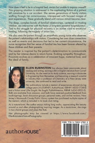 How does it feel to lie in a hospital bed, aware but unable to express oneself? This gripping situation is addressed in the captivating fiction of a patient left comatose by a car accident. She senses generations of family visitors wafting through her consciousness, interspersed with focused images of past experiences. These gradually blend until various stimuli become clear. The deep, complex bonds of familial relationships, centered on trusting children, are interwoven with the theme of long-term parental hospitalization. Tied to this struggle for physical recovery is an earlier road to emotional healing, following the tragedy of infant loss. We also view the patient through an empathetic young nurse who observes the patient's relationships with visitors. Considering her own close connections as well as events and decisions that led to her current circumstance, the nurse recognizes that her sense of familial ties has been forever altered by these children and their parents. The reader is inspired by the patient's determination to communicate and by her intense desire to return home. Evoking sympathy throughout, Proximity evolves as a celebration of innocent hope, maternal love, and the ideal of family.