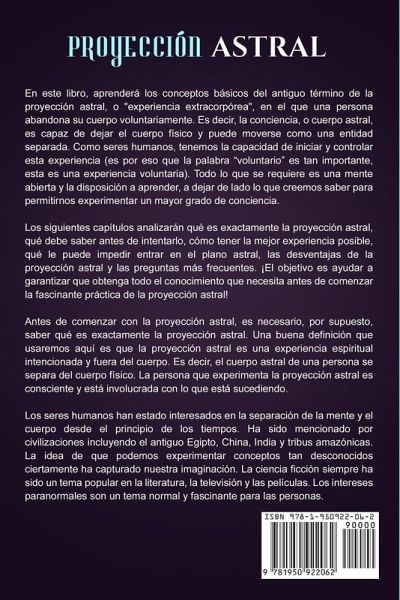 Si usted siempre ha querido sentirse mejor y ser más espiritual, pero no sabe por dónde empezar, siga leyendo... ¿Está usted harto y cansado de no lograr el crecimiento espiritual que desea, o de no tener la capacidad de dejar que su cuerpo físico viaje a través del reino astral? ¿Ha probado numerosas soluciones, pero nada parece funcionar durante más de unas pocas semanas? ¿Quiere usted finalmente decirle adiós al sentimiento de estar estancado y tener preguntas y descubrir algo que funcione? Si es así, ¡usted ha venido al lugar correcto! Como sabe, el crecimiento espiritual y los viajes astrales no tienen que ser difíciles, incluso si ya ha intentado otras soluciones que no parecen funcionar, como la hipnosis u otras técnicas paranormales. De hecho, podría ser más fácil de lo que se imagina. Hay muchos informes de proyecciones astrales exitosos con resultados positivos para los participantes que demuestran que las experiencias extracorpóreas son reales. Aquí tiene una pequeña parte de lo que podrá descubrir: Información básica sobre la proyección astral, qué es la atracción y por qué las personas desean tener experiencias extracorpóreas. Los mejores métodos y técnicas, cómo realizarlos, cómo iniciar su experiencia, información del mundo real que puede hacer en su vida diaria para mejorar la experiencia y qué esperar durante su preparación y viaje. Preguntas frecuentes: obtendrá la mayor cantidad de información posible para responder cualquier inquietud o pregunta que tenga Cómo es regresar, cómo facilitar su regreso al mundo físico y qué hacer una vez que regrese ¡Y mucho, mucho más! Tómese un segundo para imaginar cómo se sentirá una vez que haya viajado con éxito a través del reino astral y cómo reaccionará su familia y amigos cuando vean cuán tranquilo, enfocado y feliz es. Entonces, incluso si lo han decepcionado las falsas garantías y promesas que no se hicieron realidad, ¡no se preocupe! Usted aún puede aprender a tener experiencias extracorpóreas positivas con propósito con la proyección astral. ¡Obtenga este libro ahora para aprender más sobre la proyección astral!