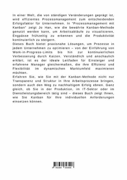In einer Welt, die von ständigen Veränderungen geprägt ist, wird effizientes Prozessmanagement zum entscheidenden Erfolgsfaktor für Unternehmen. In "Prozessmanagement mit Kanban" zeigt Jo Han, wie die bewährte Kanban-Methode genutzt werden kann, um Arbeitsabläufe zu visualisieren, Engpässe frühzeitig zu erkennen und die Produktivität kontinuierlich zu steigern.Dieses Buch bietet praxisnahe Lösungen, um Prozesse in jedem Unternehmen zu optimieren - von der Einführung von Work-in-Progress-Limits bis hin zur kontinuierlichen Verbesserung durch Kaizen. Verständlich und anschaulich erklärt, ist es der ideale Leitfaden für Einsteiger und erfahrene Manager gleichermaßen, die ihre Effizienz und Flexibilität im dynamischen Marktumfeld maximieren möchten.Erfahren Sie, wie Sie mit der Kanban-Methode nicht nur Transparenz und Struktur in Ihre Arbeitsprozesse bringen, sondern auch den Weg zu nachhaltigem Erfolg ebnen. Ganz gleich, ob Sie in der Produktion, im IT-Sektor oder im Dienstleistungsbereich tätig sind - dieses Buch zeigt Ihnen, wie Sie Kanban für Ihre individuellen Anforderungen einsetzen können.