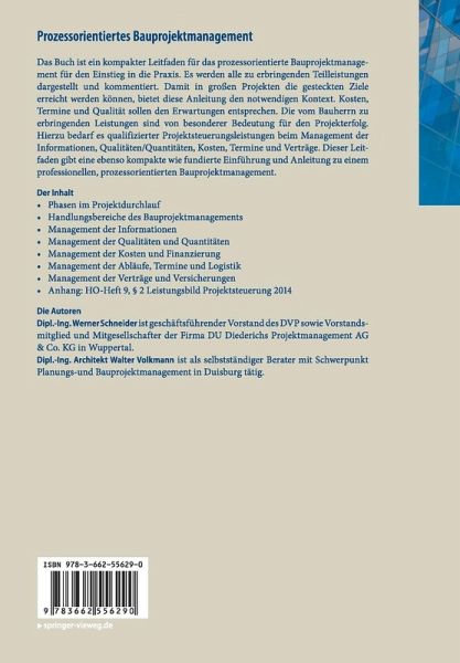 Das Buch ist ein kompakter Leitfaden für das prozessorientierte Bauprojektmanagement für den Einstieg in die Praxis. Es werden alle zu erbringenden Teilleistungen dargestellt und kommentiert. Damit in großen Projekten die gesteckten Ziele erreicht werden können, bietet diese Anleitung den notwendigen Kontext. Kosten, Termine und Qualität sollen den Erwartungen entsprechen. Die vom Bauherrn zu erbringenden Leistungen sind von besonderer Bedeutung für den Projekterfolg. Hierzu bedarf es qualifizierter Projektsteuerungsleistungen beim Management der Informationen, Qualitäten/Quantitäten, Kosten, Termine und Verträge. Dieser Leitfaden gibt eine ebenso kompakte wie fundierte Einführung und Anleitung zu einem professionellen, prozessorientierten Bauprojektmanagement.