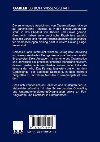 Domenico Jahn untersucht, welchen Beitrag das Controlling in prozessorientierten Reorganisationsmaßnahmen leistet. Er analysiert Ziele, Aufgaben, Instrumente und Organisation und entwickelt ein prozessorientiertes Kennzahlensystem, dessen praktische Anwendbarkeit anhand einer Fallstudie demonstriert wird. Das Kennzahlensystem basiert auf dem Gedankengut der Balanced Scorecard, in dem mehrere Zielgrößen zu einzelnen Modulen zusammengefasst werden.