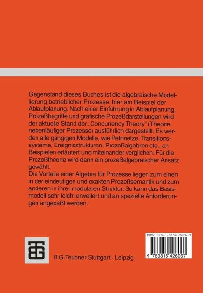 Gegenstand des Buches ist die algebraische Modellierung betrieblicher Prozesse, hier am Beispiel der Ablaufplanung. Nach einer Einführung in Ablaufplanung, Prozeßbegriffe und grafische Prozeßdarstellungen wird der aktuelle Stand der "Concurrency Theory" (Theorie nebenläufiger Prozesse) ausführlich dargestellt. Es werden alle gängigen Modelle, wie Petrinetze, Transitionssysteme, Ereignisstrukturen, Prozeßalgebren etc., an Beispielen erläutert und miteinander verglichen. Für die Prozeßtheorie wird dann ein prozeßalgebraischer Ansatz gewählt. Die Vorteile einer Algebra für Prozesse liegen zum einen in der eindeutigen und exakten Prozeßsemantik und zum anderen in ihrer modularen Struktur. So kann das Basismodell sehr leicht erweitert werden und an spezielle Anforderungen angepaßt werden.