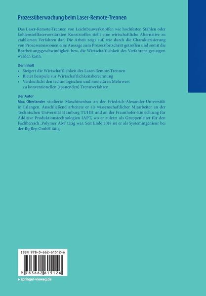 Das Laser-Remote-Trennen von Leichtbauwerkstoffen wie hochfesten Stählen oder kohlenstofffaserverstärkten Kunststoffen stellt eine wirtschaftliche Alternative zu etablierten Verfahren dar. Die Arbeit zeigt auf, wie durch die Charakterisierung von Prozessemissionen eine Aussage zum Prozessfortschritt getroffen und somit die Bearbeitungsgeschwindigkeit bzw. die Wirtschaftlichkeit des Verfahrens gesteigert werden kann.