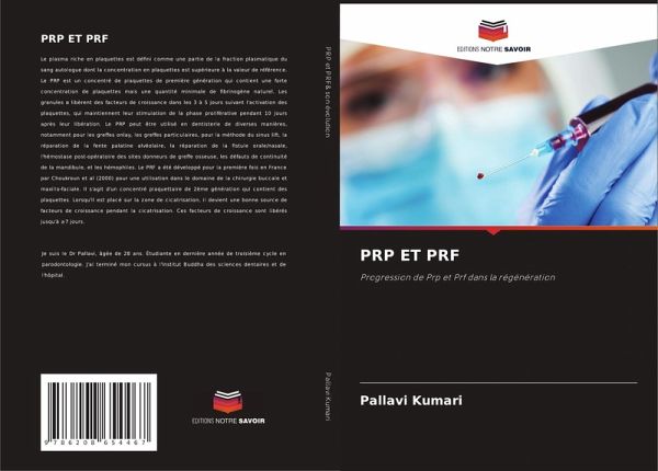 Le plasma riche en plaquettes est défini comme une partie de la fraction plasmatique du sang autologue dont la concentration en plaquettes est supérieure à la valeur de référence. Le PRP est un concentré de plaquettes de première génération qui contient une forte concentration de plaquettes mais une quantité minimale de fibrinogène naturel. Les granules libèrent des facteurs de croissance dans les 3 à 5 jours suivant l'activation des plaquettes, qui maintiennent leur stimulation de la phase proliférative pendant 10 jours après leur libération. Le PRP peut être utilisé en dentisterie de diverses manières, notamment pour les greffes onlay, les greffes particulaires, pour la méthode du sinus lift, la réparation de la fente palatine alvéolaire, la réparation de la fistule orale/nasale, l'hémostase post-opératoire des sites donneurs de greffe osseuse, les défauts de continuité de la mandibule, et les hémophiles. Le PRF a été développé pour la première fois en France par Choukroun et al (2000) pour une utilisation dans le domaine de la chirurgie buccale et maxillo-faciale. Il s'agit d'un concentré plaquettaire de 2ème génération qui contient des plaquettes. Lorsqu'il est placé sur la zone de cicatrisation, il devient une bonne source de facteurs de croissance pendant la cicatrisation. Ces facteurs de croissance sont libérés jusqu'à 7 jours.