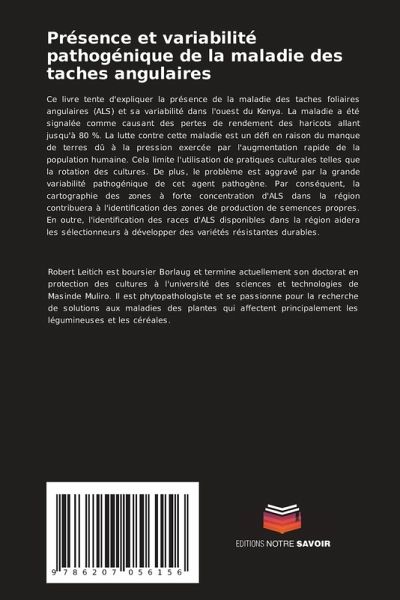 Ce livre tente d'expliquer la présence de la maladie des taches foliaires angulaires (ALS) et sa variabilité dans l'ouest du Kenya. La maladie a été signalée comme causant des pertes de rendement des haricots allant jusqu'à 80 %. La lutte contre cette maladie est un défi en raison du manque de terres dû à la pression exercée par l'augmentation rapide de la population humaine. Cela limite l'utilisation de pratiques culturales telles que la rotation des cultures. De plus, le problème est aggravé par la grande variabilité pathogénique de cet agent pathogène. Par conséquent, la cartographie des zones à forte concentration d'ALS dans la région contribuera à l'identification des zones de production de semences propres. En outre, l'identification des races d'ALS disponibles dans la région aidera les sélectionneurs à développer des variétés résistantes durables.