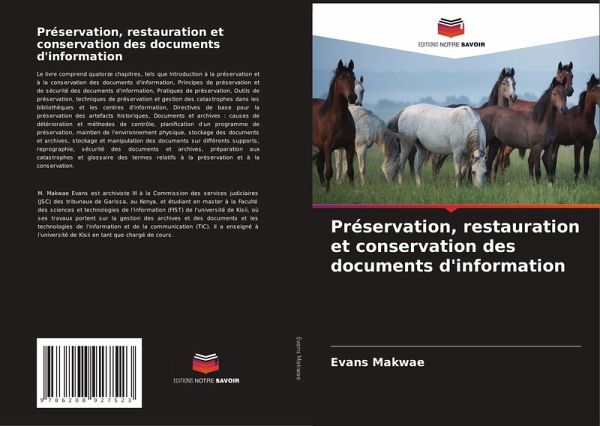 Le livre comprend quatorze chapitres, tels que Introduction à la préservation et à la conservation des documents d'information, Principes de préservation et de sécurité des documents d'information, Pratiques de préservation, Outils de préservation, techniques de préservation et gestion des catastrophes dans les bibliothèques et les centres d'information, Directives de base pour la préservation des artefacts historiques, Documents et archives : causes de détérioration et méthodes de contrôle, planification d'un programme de préservation, maintien de l'environnement physique, stockage des documents et archives, stockage et manipulation des documents sur différents supports, reprographie, sécurité des documents et archives, préparation aux catastrophes et glossaire des termes relatifs à la préservation et à la conservation.