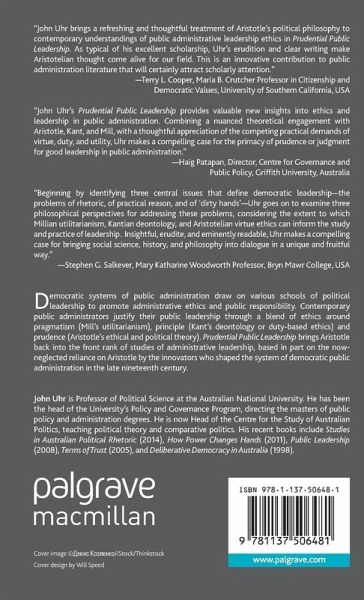 "John Uhr brings a refreshing and thoughtful treatment of Aristotle's political philosophy to contemporary understandings of public administrative leadership ethics in Prudential Public Leadership. As typical of his excellent scholarship, Uhr's erudition and clear writing make Aristotelian thought come alive for our field. This is an innovative contribution to public administration literature that will certainly attract scholarly attention." - Terry L. Cooper, Maria B. Crutcher Professor in Citizenship and Democratic Values, University of Southern California, USA