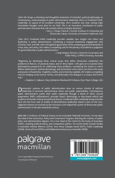 "John Uhr brings a refreshing and thoughtful treatment of Aristotle's political philosophy to contemporary understandings of public administrative leadership ethics in Prudential Public Leadership. As typical of his excellent scholarship, Uhr's erudition and clear writing make Aristotelian thought come alive for our field. This is an innovative contribution to public administration literature that will certainly attract scholarly attention." - Terry L. Cooper, Maria B. Crutcher Professor in Citizenship and Democratic Values, University of Southern California, USA