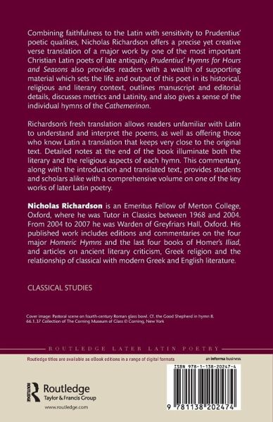 Combining faithfulness to the Latin with sensitivity to Prudentius' poetic qualities, Nicholas Richardson offers a precise yet creative verse translation of a major work by one of the most important Christian Latin poets of late antiquity. Prudentius' Hymns for Hours and Seasons provides readers with a wealth of material, which sets the life and output of this poet in its historical, religious and literary context, outlines manuscript and editorial details, discusses metrics and Latinity, and also gives a sense of the individual hymns of the Cathemerinon. The notes together with the introduction and text provide a comprehensive volume on one of the key works of later Latin poetry.