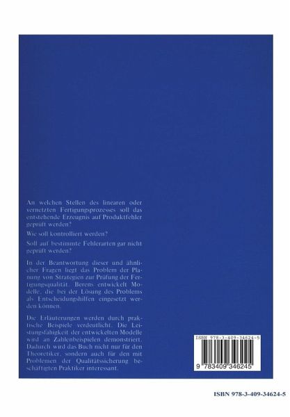 1. Die Aufgabenstellung der Arbeit.- 2. Begriffliche und methodische Grundlagen.- 21. Überblick über einige grundlegende Begriffe 2.- 22. Die Qualitätssicherung im Industriebetrieb 4.- 23. Eine Möglichkeit zur formalen Darstellung von Produkt entwürf en und Erzeugnissen 14.- 24. Produktfehler und Prüffehler 22.- 3. Die Planung von Prüfstrategien.- 31. Die generelle Problemstellung 30.- 32. Zur Zielsetzung 38.- 33. Die Daten des Entscheidungsproblems 40.- 34. Arten von Entscheidungsmodellen zur Planung von Prüfstrategien und der Aufbau des Model!teiIs der Untersuchung 44.- 4. Entscheidungsmodelle mit Prüfstellen, in denen auf alle potentiellen Fehlerarten geprüft werden muß.- 41. Die Beschreibung der Problemsituation.- 42. Die ökonomische Interpretation des Problems.- 43. Ein Entscheidungsmodell.- 44. Möglichkeiten der Modellerweiterung.- 5. Entscheidungsmodelle bei linearen Fertigungsprozessen mit Prüfstellen, in denen nicht auf alle potentiellen Fehlerarten geprüft werden muß.- 51. Das Grundmodell.- 52. Die Berucksichtigung von Prüffehlern.- 53. Die Berücksichtigung globaler Prüfungen.- 6. Entscheidungsmodelle bei vernetzten Fertigungsstrukturen mit Prüfstellen, in denen nicht auf alle potentiellen Fehlerarten geprüft werden muß.- 61. Grundbegriffe im Umgang mit vernetzten Fertigungsprozessen.- 62. Das Grundmodell.- 63. Die Anwendung des entwickelten Entscheidungsmodells, dargestellt an Beispielen.- 64. Hinweise auf Erweiterungsmöglichkeiten des entwickelten Entscheidungsmodells.- 7. Der Einsatz von Simulationsmodellen zur Planung von Prüfstrategien.- 71. Die Ausgangssituation.- 72. Die beispielbezogene Herleitung eines Simulationsmodells.- 73. Die Beurteilung des dargestellten Konzeptes.- 8. Zum Einsatz der entwickeltenEntscheidungsmodelle.- Verzeichnis der Abbildungen.- Symbolverzeichnis.