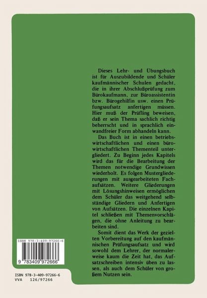 Allgemeine Richtlinien zur Anfertigung eines Prüfungsaufsatzes.- I: Fachaufsätze über betriebswirtschaftliche Themen.- 1 Die Beschaffung, das Kaufvertrags-, Lager- und Rechnungswesen.- 2 Werbung.- 3 Geld- und Zahlungsverkehr.- 4 Mahn- und Klageverfahren.- 5 Verjährung.- 6 Güterverkehr.- 7 Unternehmensformen.- 8 Die menschliche Arbeit im Betrieb.- 9 Die Sozialversicherungen.- II: Fachaufsätze über bürowirtschaftliche Themen.- 1 Der Arbeitsplatz und seine Organisationsmittel.- 2 Das Postwesen.- 3 Die betriebliche Kommunikation.- 4 Die Arbeit mit Terminen.- 5 Die Schriftgutablage (Registratur).- 6 Das Vordruckwesen.- 7 Statistik.…mehr