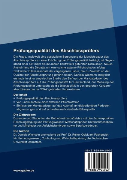 Die Frage, inwieweit eine gesetzliche Begrenzung der Mandatsdauer des Abschlussprüfers zu einer Erhöhung der Prüfungsqualität beiträgt, ist Gegenstand einer seit mehr als 30 Jahren kontrovers geführten Diskussion. Neuen Anstoß fand die Debatte um eine solche externe Pflichtrotation infolge zahlreicher Bilanzskandale der vergangenen Jahre, die zu Zweifeln an der Qualität der Abschlussprüfung geführt haben. Daniela Wiemann analysiert erstmals in einer empirischen Studie den Einfluss der Mandatsdauer des Abschlussprüfers auf die Prüfungsqualität für Deutschland. Zur Messung der Prüfungsqualität untersucht sie die Bilanzpolitik in den geprüften Konzernabschlüssen der im CDAX gelisteten Unternehmen.
